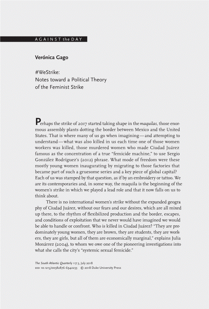 Beyond» en South Atlantic Quarterly vol. 117: 3, 2018. Incluye artículos de Verónica Gago, Raquel Gutiérrez Aguilar, Susana Draper, Mariana Menéndez Díaz. Traducido por Liz Mason-Deese.