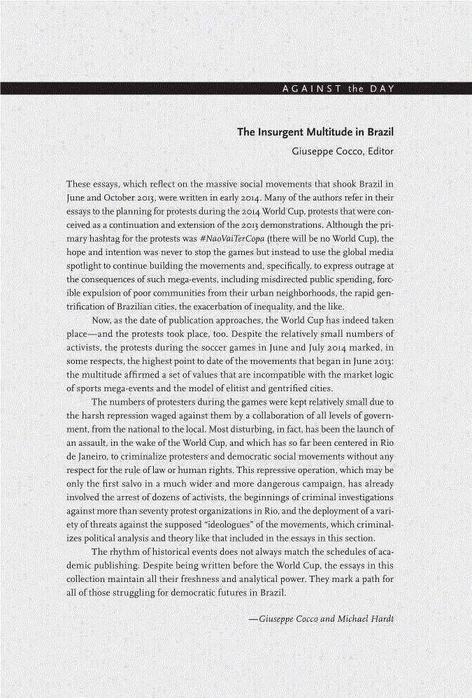 Dosier «The Insurgent Multitude in Brazil» en South Atlantic Quarterly, vol. 113: 4, 2014, con textos de Giuseppe Cocco, Bruno Cava, Hugo Alburqueque, Alexandre F. Mendes y Pedro B. Mendes. Traducido por Liz Mason-Deese.