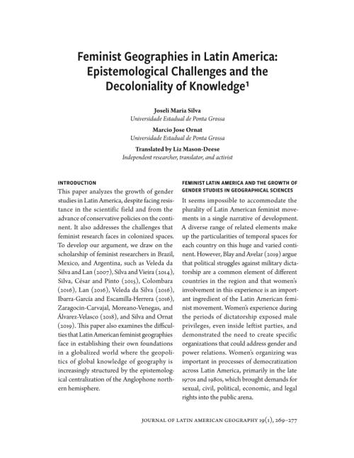 «Feminist Geographies in Latin America: Epistemological Challenges and the Decoloniality of Knowledge», de Joseli Maria Silva, Marcio Jose Ornat. Traducido por Liz Mason-Deese