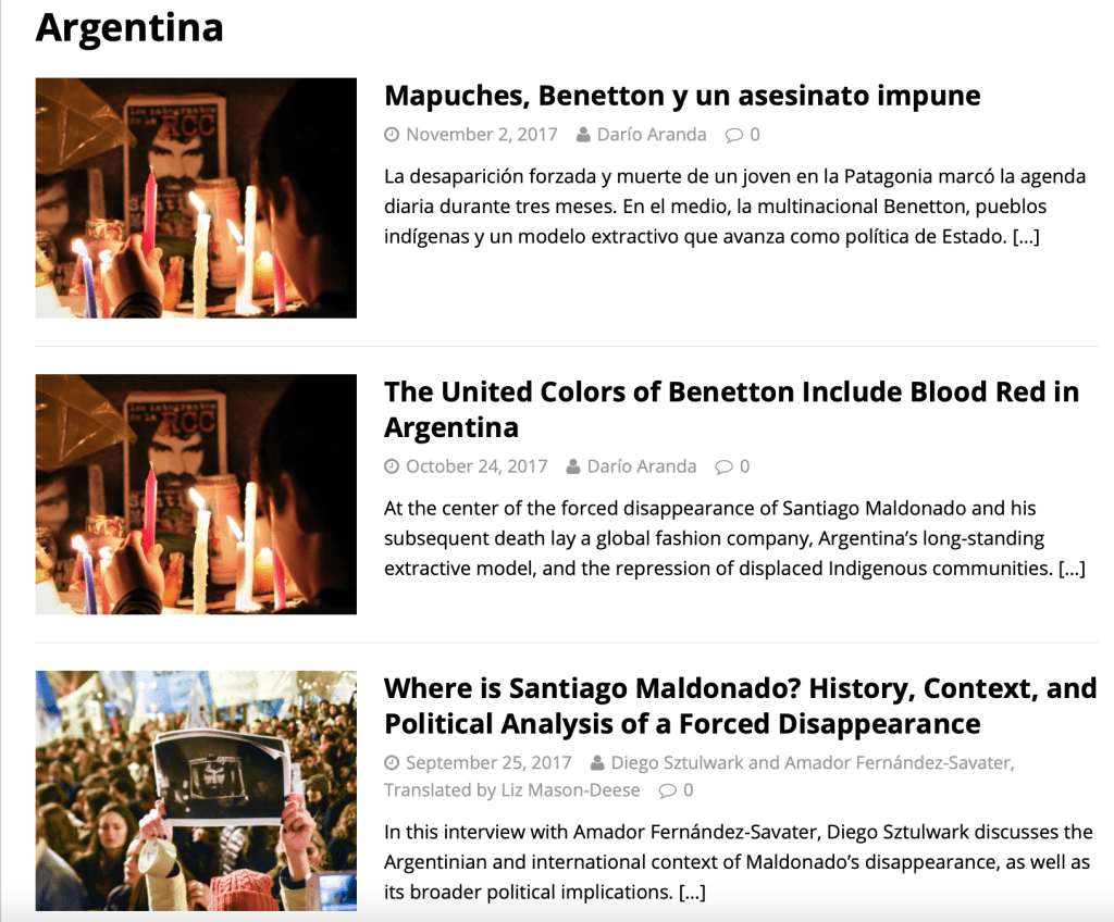 Este colectivo de periodistas de distintos puntos del continente americano, fundado en 2003, ha tenido por objeto difundir noticias y análisis sobre América Latina en inglés y español. Con el foco puesto en las luchas y la resistencia de los movimientos sociales y los colectivos que pueblan Nuestra América, tanto los periodistas como los traductores colaboradores de este espacio entienden necesario contrarrestar los discursos de los medios hegemónicos. Otra intervención como traductoras ha sido el de querer acercar al colectivo a periodistas de nuestros territorios. Este también ha sido un espacio en el que se tejieron redes norte-sur. Con algunos de ellos seguimos trabajando al día de hoy. Miembro del colectivo: Nancy V. Piñeiro. Traducciones y colaboraciones de Laura Beratti, Liz Mason-Deese y Nancy Piñeiro.